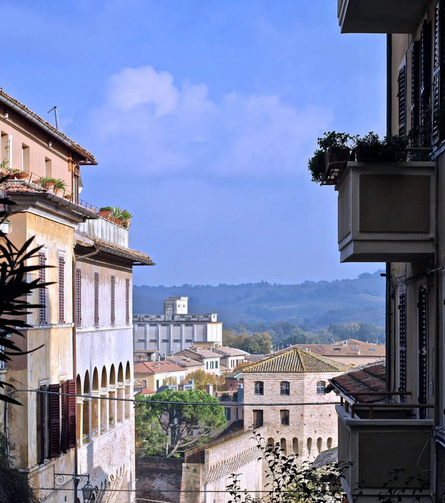 Walking down a quiet cobblestone road in a castle in Jesi (Marche, Italy), we passed two men installing a lamp above a door. Their small van parked on the narrow road made passing by a little tight. “Buongiorno, sono Americana” (hello, I am American), I said as I squeezed through.