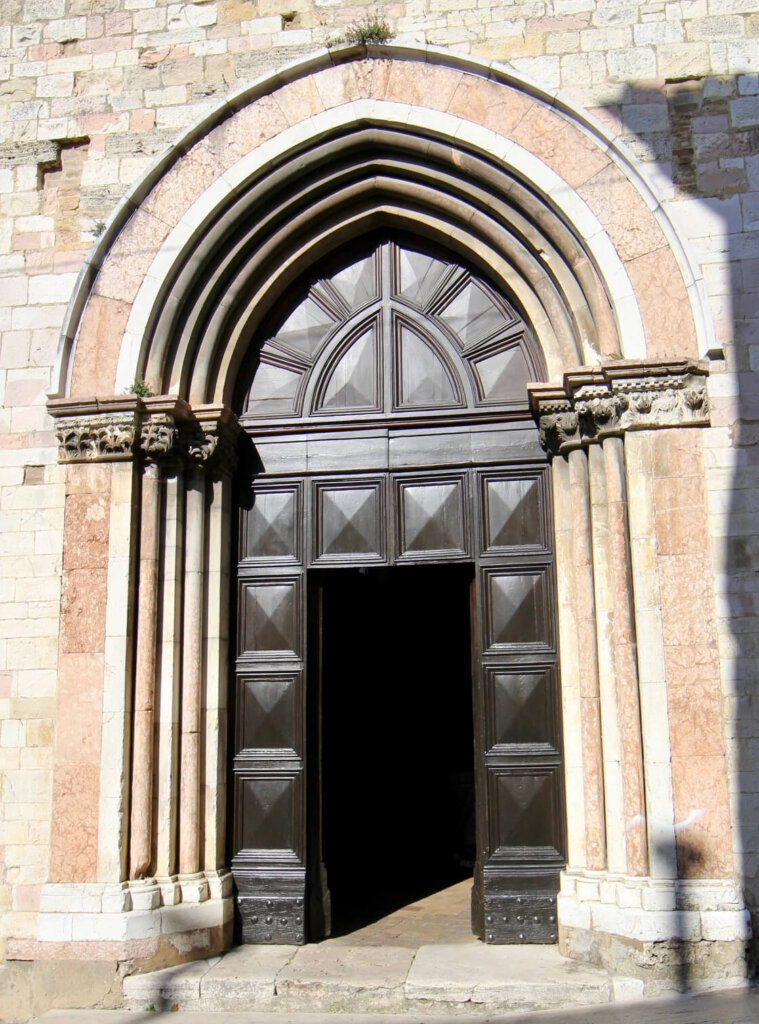 The Church of Sant’Agostino in Montefalco is an example of Umbrian Gothic architecture, reflecting the strong presence of the Augustinian order in the region during the 13th century. Its construction began around 1270, soon after the Augustinian friars established their presence in Montefalco. Its rapid completion in 1275 mirrored the era’s religious intensity and the rise of mendicant orders.