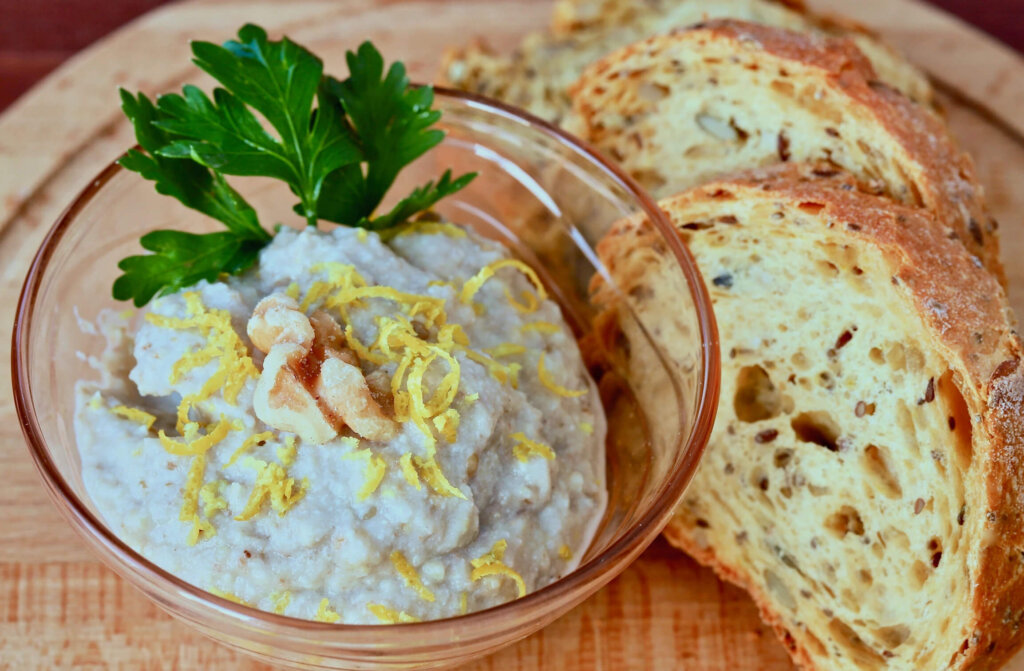 Silky and nutty with walnuts, lemon and garlic, is a simple dip, spread, or side to grilled and roasted dishes. Way back in the 70s I worked my way through college as a sous chef at Chico Cheese and Charcuterie. It was a small place owned by Bill and Tom. I was their only employee. We had over 300 kinds of imported cheeses and house-made delicacies to go. This spread was very popular.