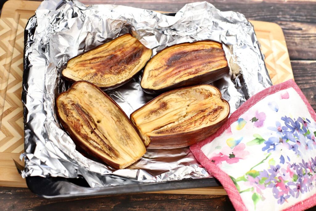 Remove from the oven and let cool. Once cooled, peel off the skin or scoop out the eggplant with a spoon.