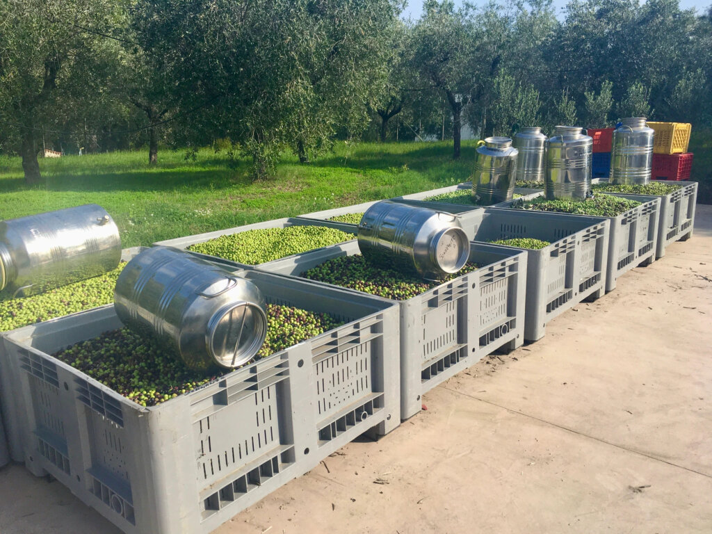 Crushing the fruit is the second phase of the harvest. Various wineries and olive mills provide this service, and for a small fee, you can turn your olives into the freshest olive oil available! You can also find olive mills that still use stones to grind the olives versus a crusher.