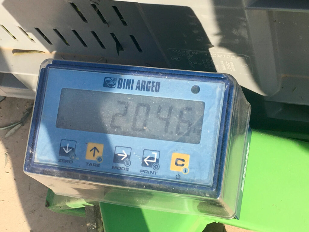 We moved our load to their large crates, filling seven this year! They use a forklift scale to weigh the loads; mine came in at 2048 kilos of olives.