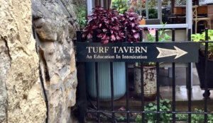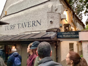 The Turf Tavern began as a malt house in the 13th century beside Oxford’s medieval city wall. The building still shows features from earlier centuries, including its timber beams and low ceilings. As recorded during the 1381 reign of King Richard II, the tavern operated as a drinking house. It was originally called the “Spotted Cow” and was a place for gambling and betting outside the city walls, where that wasn’t allowed. The current name, “Turf Tavern,” was adopted in the 19th century during an effort to change its reputation.
