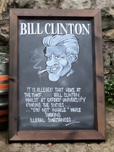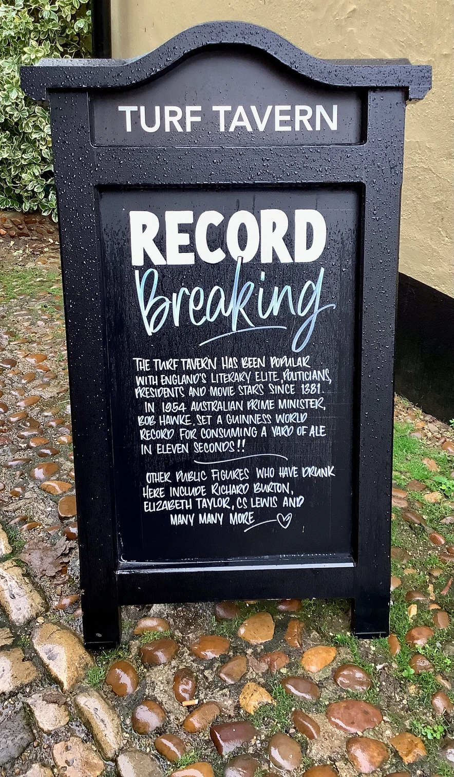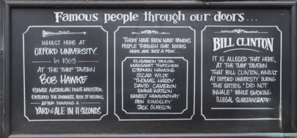 Notable political individuals, such as Bill Clinton when he was a student, Tony Blair, Margaret Thatcher, and Bob Hawke, have visited the Turf Tavern. (I had to look up Hawke—he was Australia’s 23rd Prime Minister, 1983 to 1991.) Oxford produced many politicians.